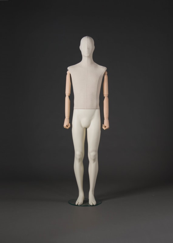 Manichino uomo testa stilizzata busto rivestito tessuto ecru'